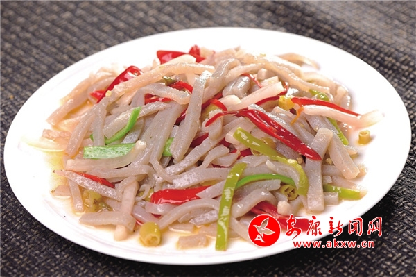酸辣魔芋:是嵐皋特色名菜,也是當(dāng)?shù)胤沁z項目之一。以秋收后鮮魔芋漿汁為原料,加入堿水煮制,冷固后呈豆腐形狀,切塊后與當(dāng)?shù)嘏莶艘黄鸫蠡鸱炊。魔芋中?ldquo;堿”和泡菜中的“酸”完美結(jié)合,具有保護(hù)腸胃、排毒養(yǎng)顏、減肥瘦身的功效,同時還能降血糖、降血脂、降血壓。嵐皋民諺“要見好公婆,多吃鬼腦殼”,說的是姑娘吃了魔芋豆腐,瘦體健身、容光煥發(fā),能得到公婆的好感,F(xiàn)代醫(yī)學(xué)認(rèn)為,魔芋豆腐中含量最大的葡萄甘露聚糖,具有強大的膨脹力,超過任何一種植物膠的黏韌度,既可填充胃腸,消除饑餓感,又因所含熱量微乎其微,故能控制體重、減肥健美。此外,魔芋豆腐既能開胃化食,又能清除腸道垃圾,有防癌抗癌的神奇魔力,享有“防癌魔衣”“神奇食品”的美譽。