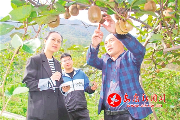 縣農(nóng)業(yè)農(nóng)村局高級(jí)農(nóng)藝師、科技特派員謝利華,帶領(lǐng)科研團(tuán)隊(duì)在基地記錄不同區(qū)域獼猴桃品種生長情況,采收獼猴桃新品準(zhǔn)備送檢。