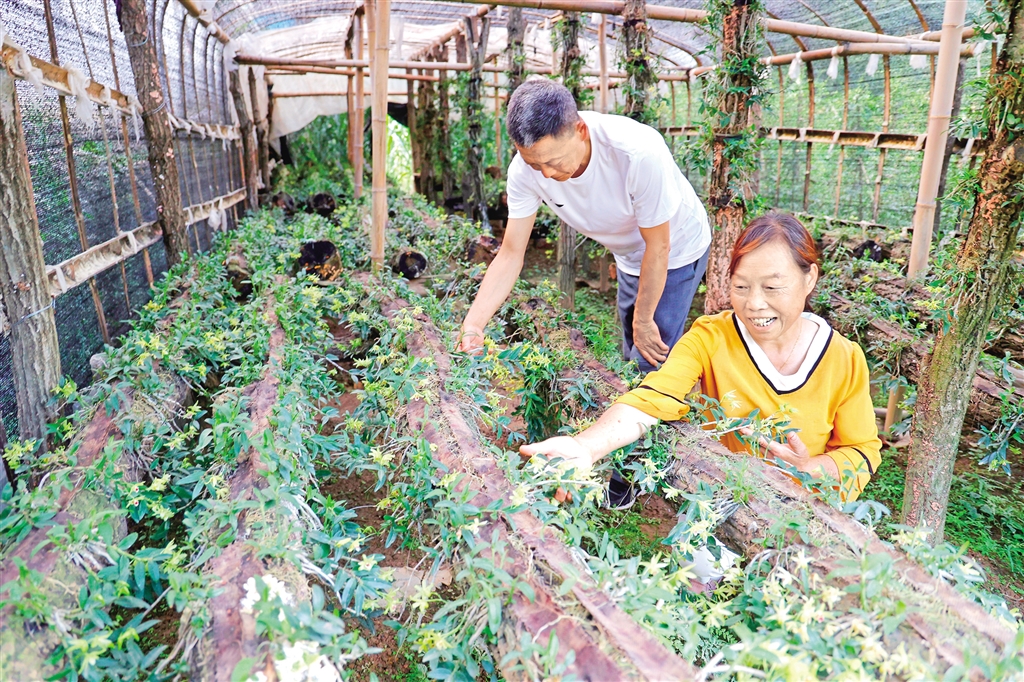 大道河鎮(zhèn)月池臺(tái)村四組胡德銀與妻子查看鐵皮石斛的生長情況。張?zhí)毂?攝