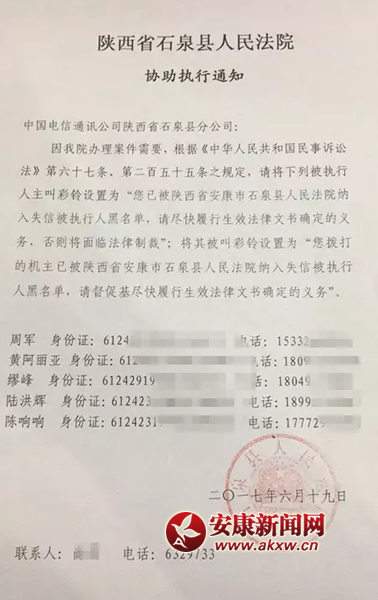 6月19日下午,石泉法院將首批需要進(jìn)行通信限制的11名“老賴”名單提供給了三大通信公司,要求其協(xié)助執(zhí)行。