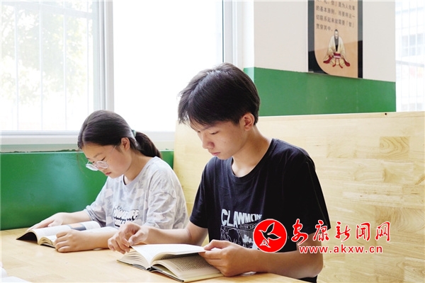 馬英琦(右)在石泉中學圖書館看書