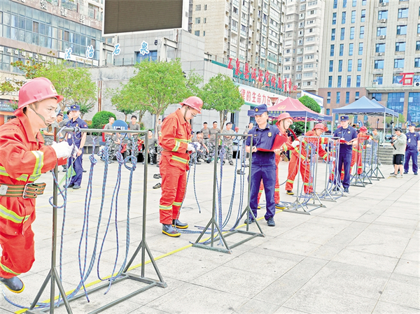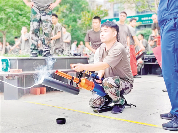 “應(yīng)急通信與拋投設(shè)備”科目賽場,科技含量高。無人機(jī)騰空而起,飛向模擬的7樓窗口查看電話號碼,衛(wèi)星電話迅速撥通,接收考官指令;拋投器精準(zhǔn)發(fā)射,命中目標(biāo)區(qū)域。