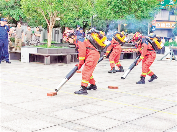 完成后,隊(duì)員迅速背負(fù)風(fēng)力滅火機(jī),將起點(diǎn)處的紅磚吹過10米終點(diǎn)處。風(fēng)力滅火機(jī)呼嘯作響,隊(duì)員們需精準(zhǔn)控制風(fēng)力方向和強(qiáng)度,這模擬的是實(shí)戰(zhàn)中清理障礙物、開辟隔離帶的場景。
