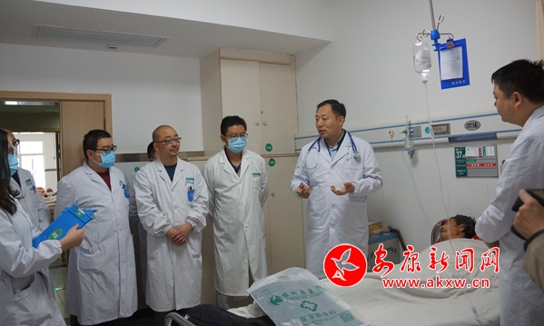 練學(xué)淦首先在鎮(zhèn)坪縣醫(yī)院內(nèi)科病區(qū),以2名腦梗塞患者為例進(jìn)行示范性教學(xué)查房,來到病房詳細(xì)聽取了主管醫(yī)生的病例匯報(bào)。在凝神聽取主管醫(yī)生的匯報(bào)后,練主任在患者床旁同患者及家屬交談,并親自進(jìn)行查體,了解疾病發(fā)展過程中的每個(gè)細(xì)節(jié),一絲不茍的從頭查起。