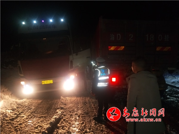 1月6日至8日鎮(zhèn)坪持續(xù)大到暴雪天氣,雞心嶺路段因海拔較高,積雪結(jié)冰嚴(yán)重,導(dǎo)致30余輛大型貨車(chē)滯留。鎮(zhèn)坪交警及時(shí)上山疏導(dǎo)交通,對(duì)發(fā)生緊急情況的車(chē)輛進(jìn)行救援,并對(duì)未采取防滑措施的車(chē)輛進(jìn)行勸返,截至1月8日上午11時(shí)交警仍然在該路段進(jìn)行救援工作。(圖文/趙榮鵬)JxD安康新聞網(wǎng)
