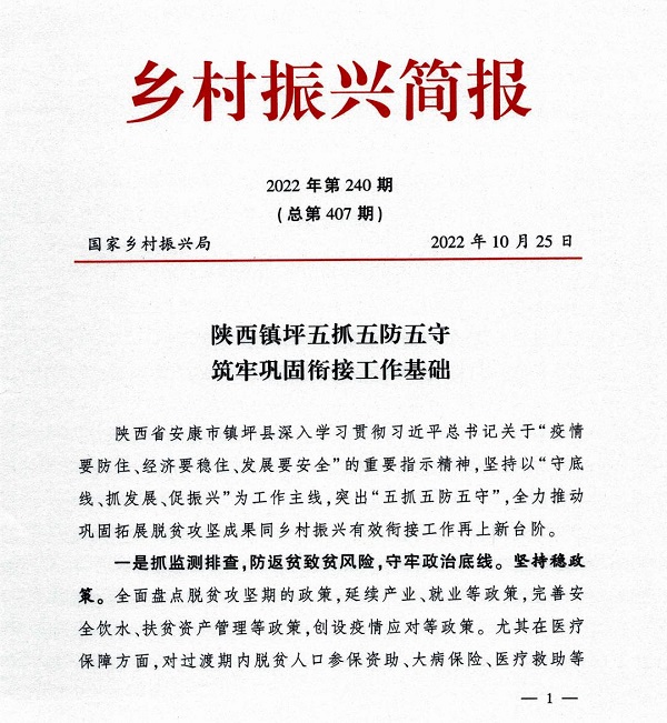 國家鄉(xiāng)村振興局簡報2022年第240期刊發(fā)《陜西鎮(zhèn)坪:五抓五防五守 筑牢鞏固銜接基礎(chǔ)》,全文如下:
