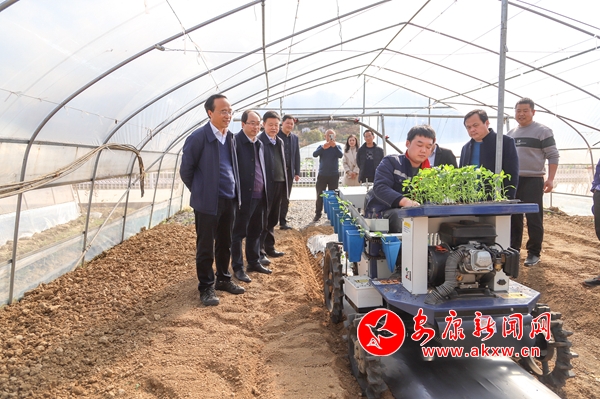 在漢陰縣七葉蓮農(nóng)業(yè)科技有限公司蔬菜種植基地,魯琦走進(jìn)溫室育苗棚和蔬菜大棚,詳細(xì)了解辣椒、黃瓜、西紅柿等蔬菜育苗及旋耕機整地、辣椒機械化栽植情況,對公司“六統(tǒng)一”發(fā)展方式給予充分肯定。他說,要以“1+10+N”蔬菜保供基地建設(shè)為契機,圍繞提升設(shè)施裝備、科技支撐、組織經(jīng)營現(xiàn)代化水平,聚力推進(jìn)高標(biāo)準(zhǔn)農(nóng)田、冷鏈物流等基礎(chǔ)設(shè)施建設(shè),持續(xù)在農(nóng)機推廣、質(zhì)量控制、品牌打造、產(chǎn)銷對接上下功夫,加快完善蔬菜生產(chǎn)保供體系,不斷提升蔬菜自給率,確保“菜籃子”安全穩(wěn)產(chǎn)保供。