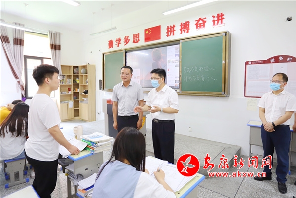 在漢濱高中, 寇全安一行先后檢查了入校檢測點、防疫物資儲備、監(jiān)控平臺運行等,了解考點參考人數(shù)、考場布置,以及食品安全、試卷保密等備考保障措施落實情況,叮囑要壓實各方責(zé)任,加強統(tǒng)籌配合,為廣大考生營造安全安靜、舒適舒心的考試環(huán)境。在江北高中和漢陰縣第二中學(xué),他走進(jìn)教室和高考學(xué)子交談,勉勵他們保持良好心態(tài),從容備考應(yīng)考,并祝福考生取得優(yōu)異成績;還著重了解了學(xué)校心理咨詢室運行情況,并就如何開展心理健康教育和預(yù)防校園暴力與校長、部分教師進(jìn)行了交流探討。