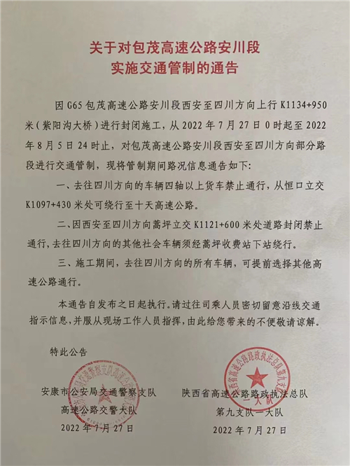 即日起至8月5日 包茂高速公路安川段實(shí)施交通管制