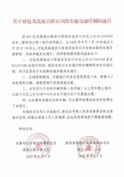 即日起至8月20日 包茂高速公路安川段實(shí)施交通管制