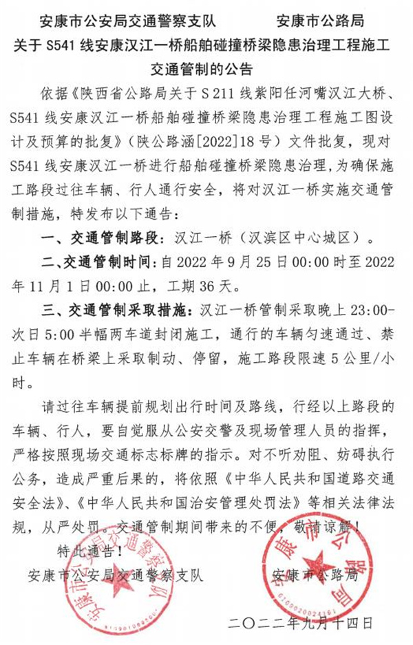 9月25日至11月1日安康漢江一橋?qū)⑦M(jìn)行船舶碰撞橋梁隱患治理工程施工,將對(duì)漢江一橋?qū)嵭?strong>交通管制36天,管制采取晚上23:00-次日5:00半幅兩車道封閉施工,通行的車輛勻速通過(guò),禁止車輛在橋梁上采取制動(dòng)、停留,施工路段限速5公里/小時(shí)。qmU安康新聞網(wǎng)