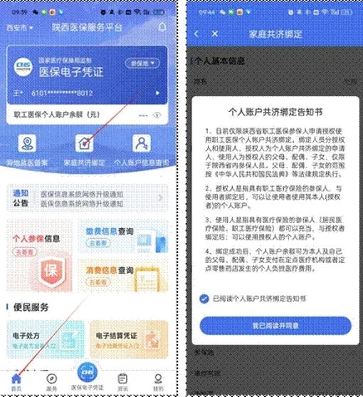 進(jìn)入陜西醫(yī)保APP后,在首頁菜單中,選擇“家庭共濟(jì)綁定”,進(jìn)入頁面后仔細(xì)閱讀告知書內(nèi)容,閱讀完成后勾選“已閱讀個人賬戶共濟(jì)綁定告知書”,點(diǎn)擊“我已閱讀并同意”按鈕,進(jìn)入家庭共濟(jì)信息填寫頁面。