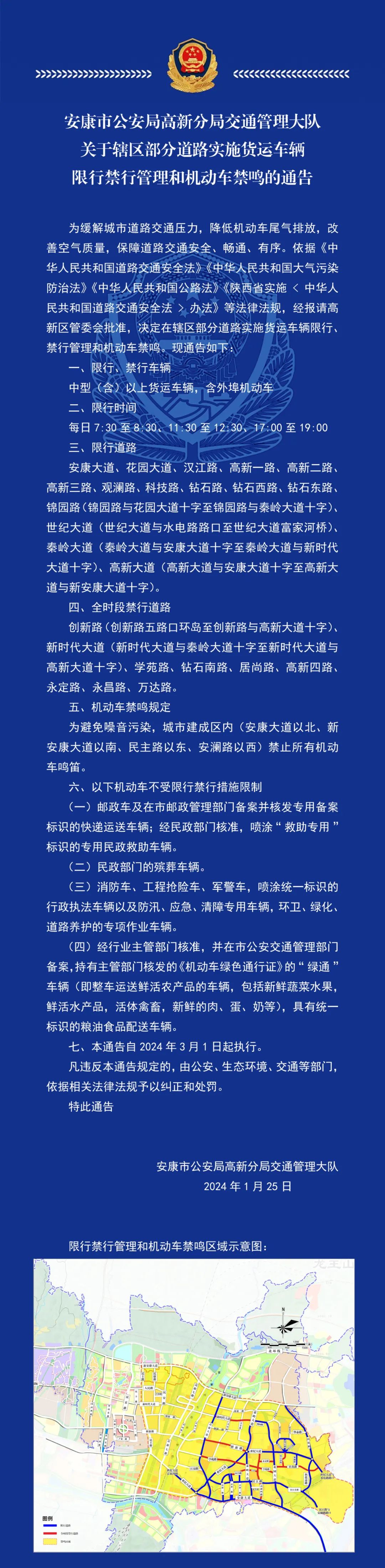 安康高新交警發(fā)布公告:轄區(qū)部分道路實施貨運車輛限行禁行管理和機動車禁鳴