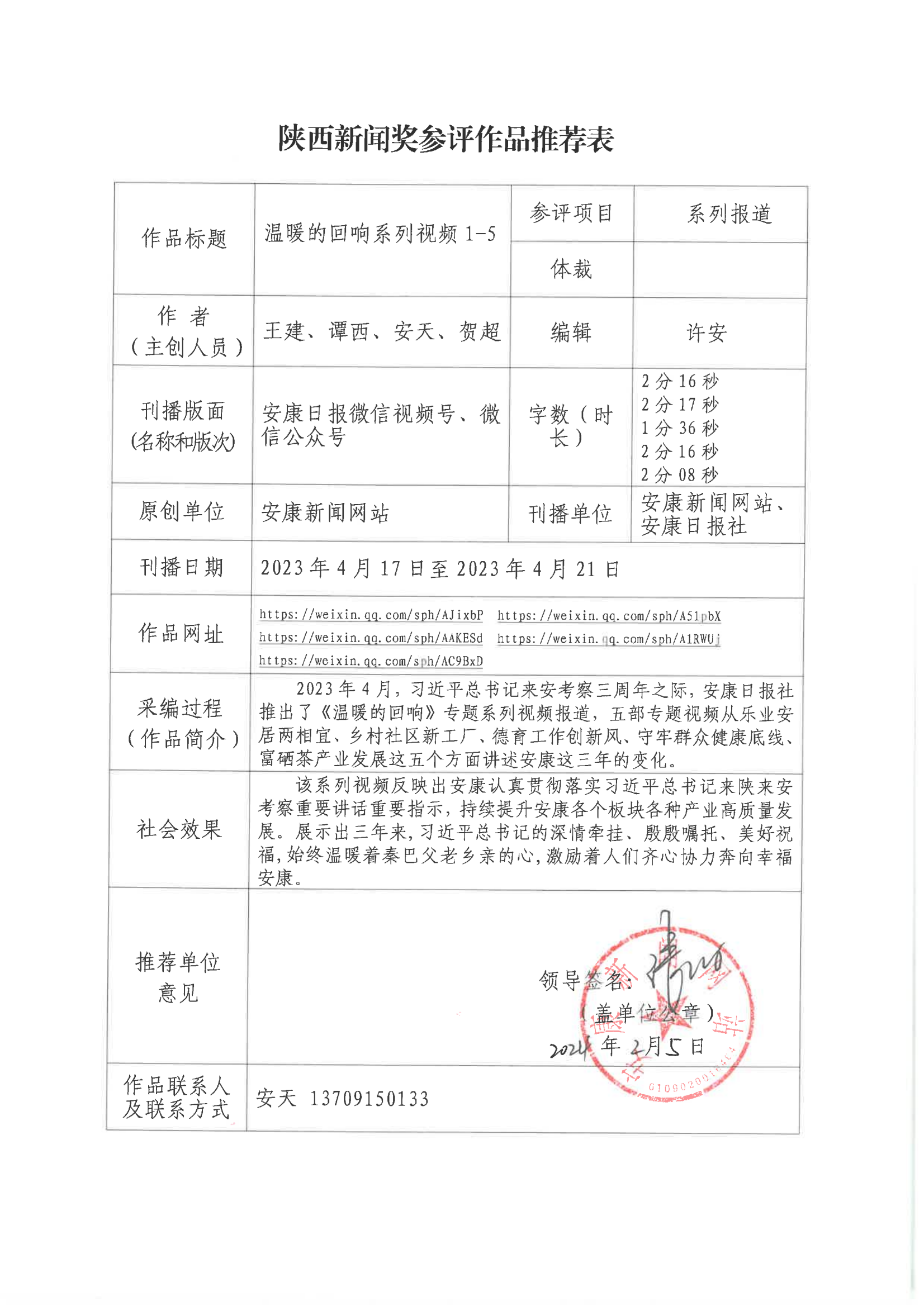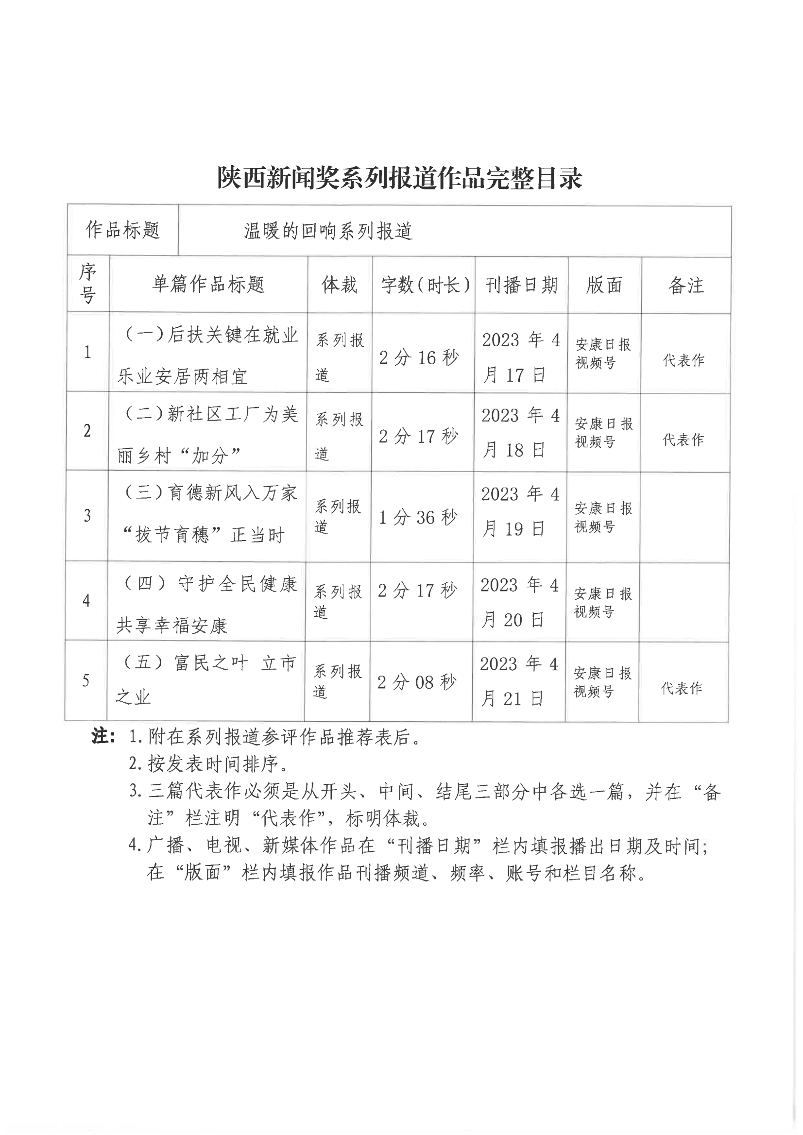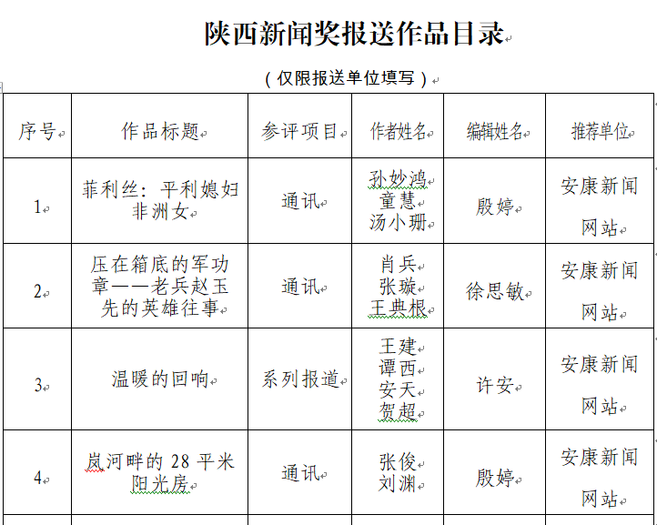 經(jīng)過(guò)1月30日編委會(huì)推薦、社黨委研究決定,擬推薦以下4件新聞作品參評(píng)2023年度“陜西新聞獎(jiǎng)”。公示時(shí)間從2024年3月6日至2024年3月12日,公示期為5個(gè)工作日。如有不同意見,請(qǐng)向安康日?qǐng)?bào)社機(jī)關(guān)紀(jì)委、新聞管理部反映。RAj安康新聞網(wǎng)