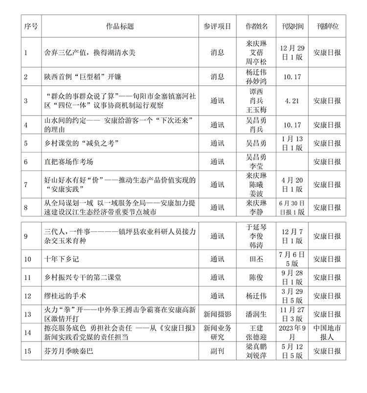 經過1月30日編委會推薦、社黨委研究決定,擬推薦以下15件新聞作品參評2023年度“陜西新聞獎”。公示時間從2024年3月6日至2024年3月12日,公示期為5個工作日。如有不同意見,請向安康日報社機關紀委、新聞管理部反映。RQa安康新聞網