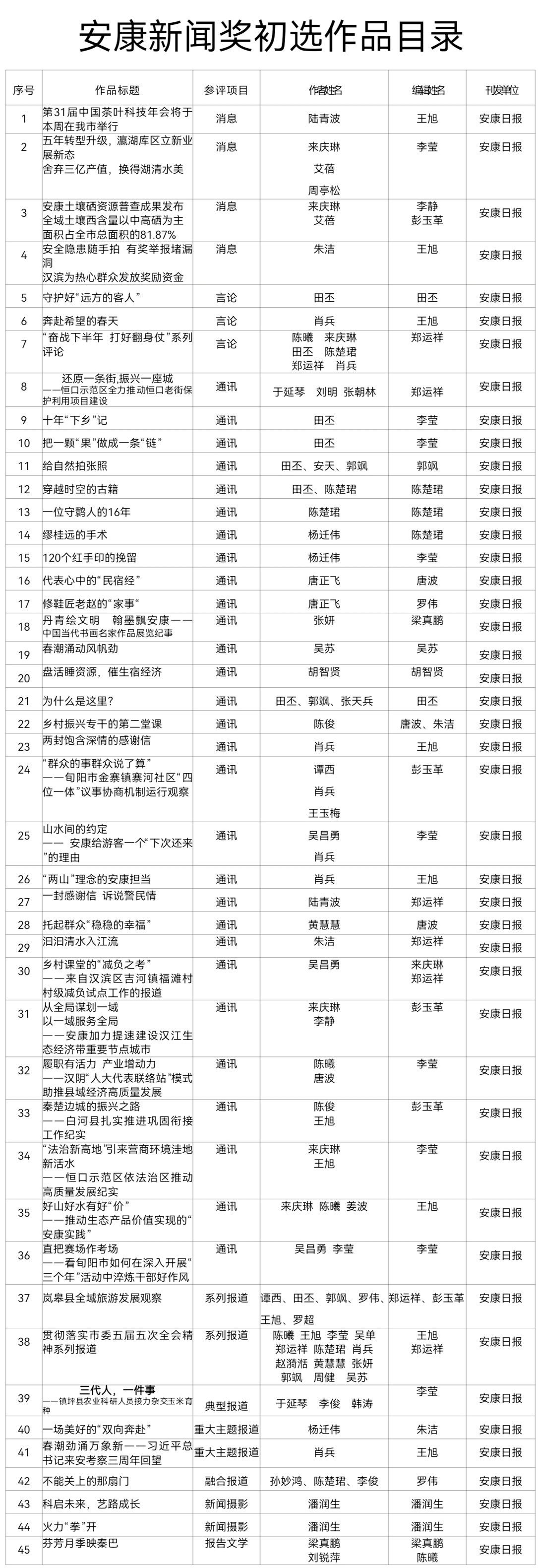 經(jīng)過3月20日編委會(huì)推薦、社黨委研究決定,擬推薦以下45件新聞作品參評(píng)2023年度“安康新聞獎(jiǎng)”。公示時(shí)間從2024年3月21日至2024年3月27日,公示期5個(gè)工作日。如有不同意見,請(qǐng)向安康日?qǐng)?bào)社機(jī)關(guān)紀(jì)委、新聞管理部反映。waq安康新聞網(wǎng)