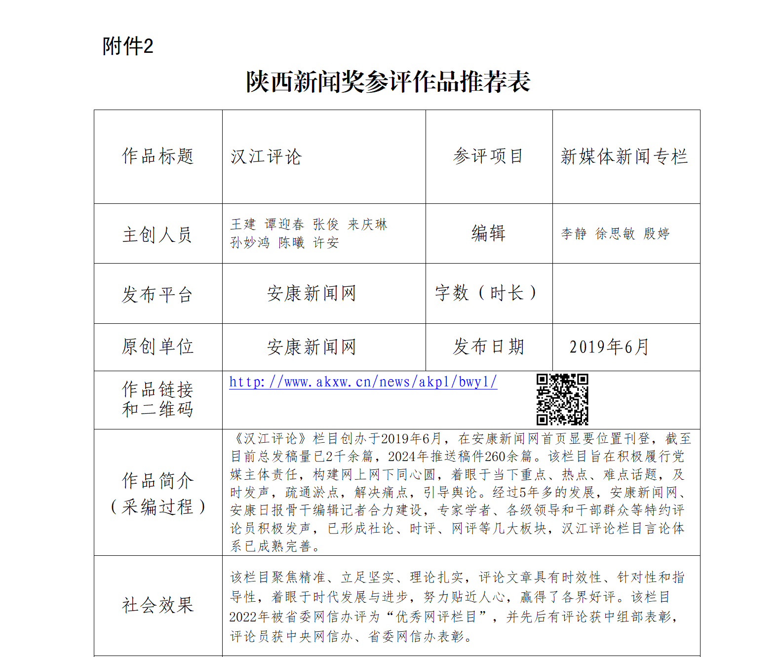 經(jīng)過社黨委研究決定,擬推薦以下2件新聞作品參評(píng)“2024年度陜西新聞獎(jiǎng)融合報(bào)道、應(yīng)用創(chuàng)新和新媒體新聞專欄”。公示時(shí)間從2025年1月6日至2025年1月10日,公示期5個(gè)工作日。如有不同意見,請(qǐng)向安康日?qǐng)?bào)社機(jī)關(guān)紀(jì)委、新聞管理部反映。zRn安康新聞網(wǎng)