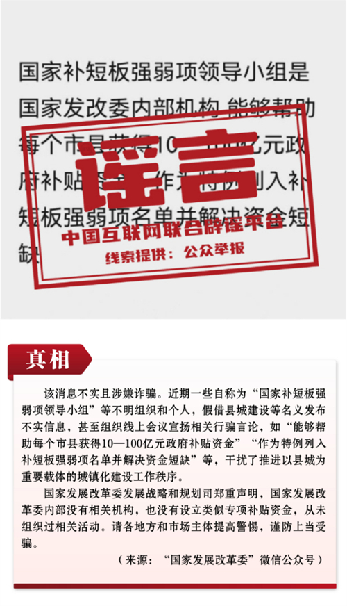 謠言2:有“國(guó)家補(bǔ)短板強(qiáng)弱項(xiàng)領(lǐng)導(dǎo)小組”并設(shè)立專項(xiàng)補(bǔ)貼?