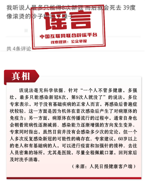 傳“偽科普”販賣(mài)焦慮引恐慌。5月以來(lái),全國(guó)多地入夏,迎來(lái)炎熱高溫天氣,與季節(jié)關(guān)聯(lián)性較強(qiáng)的科普信息備受關(guān)注,“空調(diào)反復(fù)開(kāi)關(guān)能省電”“夏天吃‘苦’勝似進(jìn)補(bǔ)”等誤區(qū)信息也隨之被炒作、散布。特別是近來(lái)新冠“二陽(yáng)”病例增多,“新冠抗體半年保護(hù)期”“新冠病毒新型變異株”等信息在網(wǎng)上引發(fā)熱議,給民眾心里平添“忐忑”。于是,有人借機(jī)搭蹭熱點(diǎn),以“科普”之名捏造“一個(gè)人不管多健康,多強(qiáng)壯,最多只能感染新冠8次,第9次人就沒(méi)了……”等聳人聽(tīng)聞的謠言,盡管有專家駁斥其“純屬無(wú)稽之談,毫無(wú)科學(xué)依據(jù)”,但仍在一定程度上激發(fā)了部分人群的恐慌情緒。