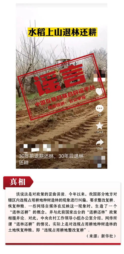 歪曲杜撰,冒用官方名義設(shè)騙局。不法分子冒用國家部委、國企或權(quán)威機(jī)構(gòu)名義,偽造文件、捏造虛假信息對外發(fā)布,企圖擾亂正常市場秩序并從中行騙牟利。諸如“財(cái)政部發(fā)行金融債券”“三部門聯(lián)合發(fā)文將發(fā)放家庭農(nóng)場等專項(xiàng)涉農(nóng)補(bǔ)貼”“國鐵集團(tuán)授權(quán)‘八縱八橫 ’APP推出理財(cái)產(chǎn)品”“中國商飛發(fā)布‘C919私募基金’等投資理財(cái)項(xiàng)目”等信息迷惑性極強(qiáng),實(shí)為騙子以高額返利為誘餌設(shè)置的陷阱。此外,還有自媒體歪解誤讀公共政策,有意混淆概念誤導(dǎo)公眾。如,針對“違規(guī)占用耕地整改復(fù)耕”,生造“退林還耕”概念,并將其與此前國家出臺(tái)的“退耕還林還草”政策相提并論,實(shí)質(zhì)是對加強(qiáng)耕地保護(hù)和用途管控的歪曲。