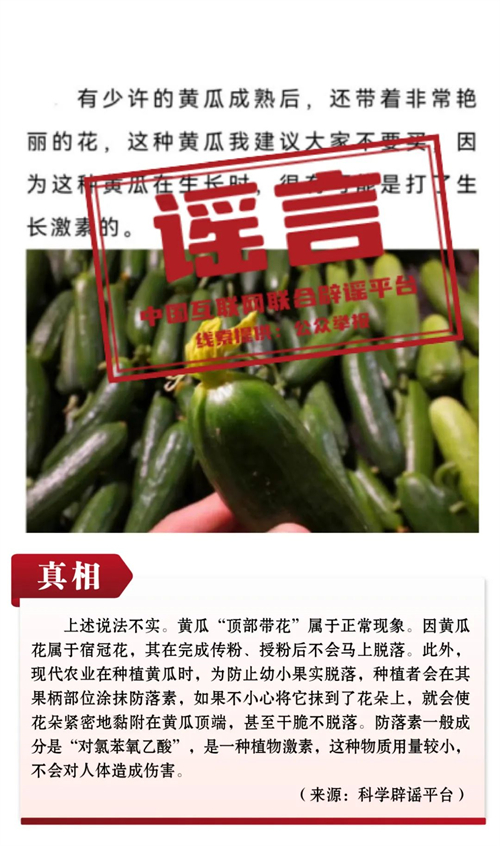謠言10:黃瓜頂部帶花是因?yàn)榇蛄思に,不能吃?/strong>