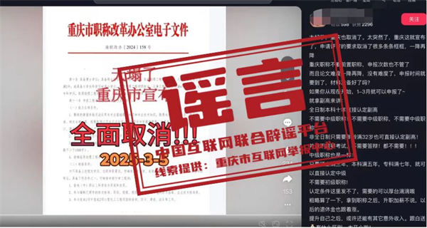 真相:近日,有網(wǎng)民在互聯(lián)網(wǎng)平臺(tái)發(fā)布消息稱“重慶市宣布,申請?jiān)u審的要求取消了很多條條框框,職稱申請不看前置職稱,全日制本科十年直接認(rèn)定副高,不需要中級職稱”,引發(fā)關(guān)注。經(jīng)核實(shí),網(wǎng)傳信息系謠言。職稱評審均需逐級晉升,取得上一級職稱并滿足相應(yīng)學(xué)歷資歷條件后方可晉升高一級職稱。目前重慶市除特殊人才、博士后等3個(gè)針對特定對象的職稱申報(bào)綠色通道外,正常申報(bào)通道均需逐級晉升。網(wǎng)傳文件是網(wǎng)民通過P圖軟件編輯而成,試圖吸引不明真相的群眾咨詢,借機(jī)推銷職稱代辦服務(wù),收取高額費(fèi)用。目前,謠言線索已轉(zhuǎn)交公安機(jī)關(guān)進(jìn)一步調(diào)查處置。(來源:“重慶辟謠”微信公眾號(hào))