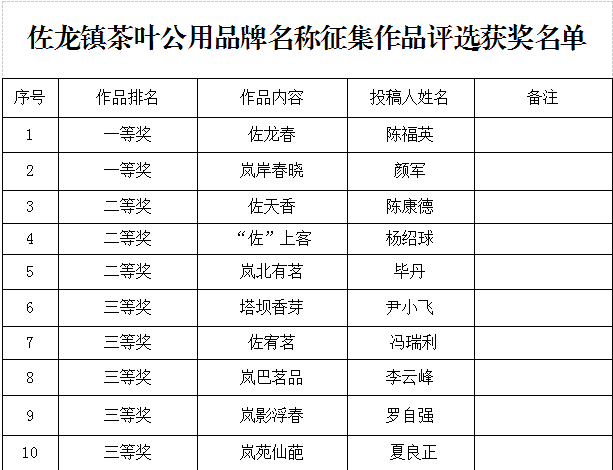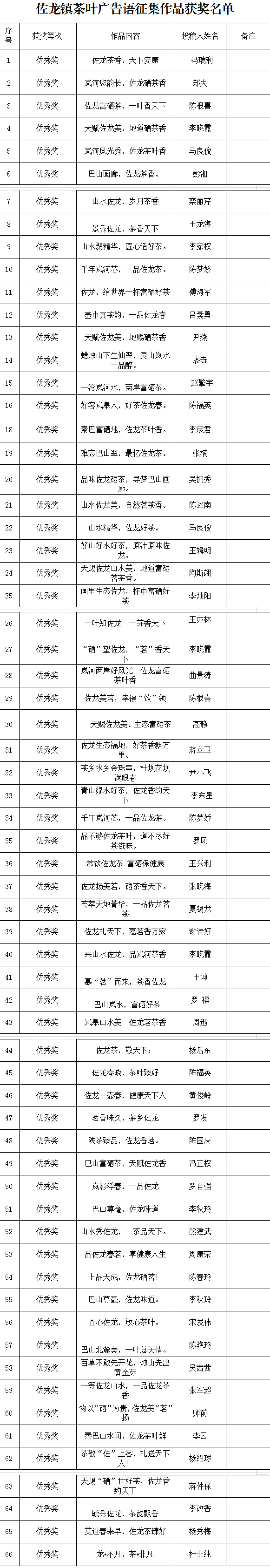 嵐皋縣佐龍鎮(zhèn)黨委、鎮(zhèn)政府在安康日?qǐng)?bào)、安康新聞網(wǎng)發(fā)布《佐龍鎮(zhèn)有獎(jiǎng)?wù)骷枞~公用品牌名稱及廣告語(yǔ)公告》以來(lái),得到社會(huì)各界人士的積極響應(yīng)和支持。本次收集到的所有作品,佐龍鎮(zhèn)安排專人逐一按時(shí)間順序統(tǒng)一排序備選,經(jīng)組委初選、專家評(píng)選,已評(píng)選出獲獎(jiǎng)作品擬予以獎(jiǎng)勵(lì),現(xiàn)將擬獲獎(jiǎng)名單進(jìn)行公示,其中一等獎(jiǎng)2名,二等獎(jiǎng)3名,三等獎(jiǎng)5名,優(yōu)秀獎(jiǎng)66名,公示時(shí)間自發(fā)布之日起至2021年12月31日17時(shí)。擬獲獎(jiǎng)名單如下: