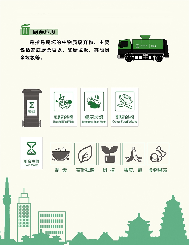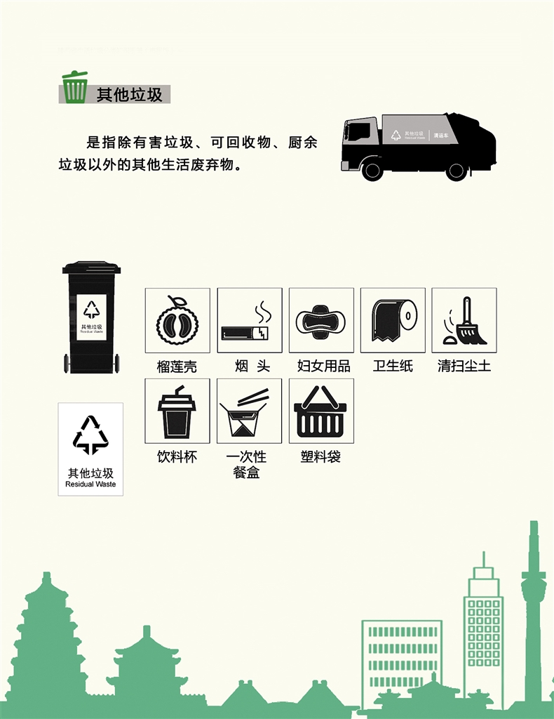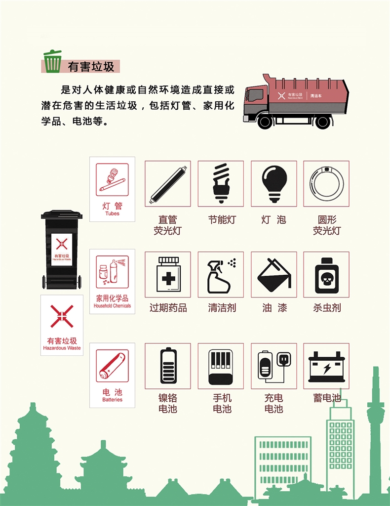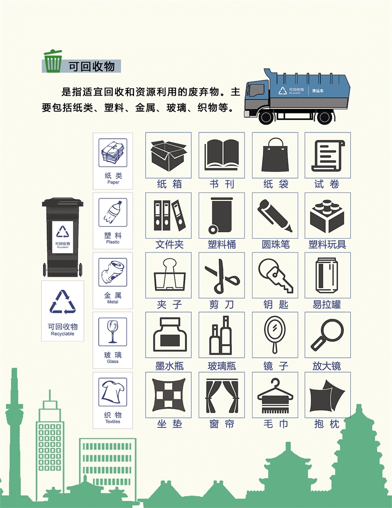 垃圾可以分為可回收垃圾、廚余垃圾、有害垃圾和其他垃圾四類?苫厥绽饕◤U紙、塑料、玻璃、金屬和布料五大類;廚余垃圾包括剩菜剩飯、骨頭、菜根菜葉、果皮等食品類廢物;有害垃圾包括廢電池、廢日光燈管、廢水銀溫度計(jì)、過期藥品等,這些垃圾需要特殊安全處理;其他垃圾包括除上述幾類垃圾之外的磚瓦陶瓷、渣土、衛(wèi)生間廢紙、紙巾等難以回收的廢棄物,采取衛(wèi)生填埋可有效減少對(duì)地下水、地表水、土壤及空氣的污染。