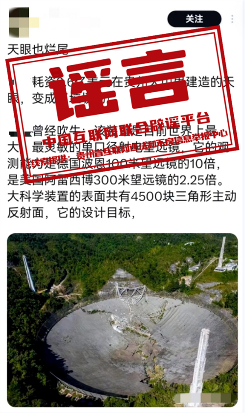 真相:近日,海外社交平臺有網(wǎng)民發(fā)布一張圖片,聲稱“耗資2.6億美元在貴州大山里建造的天眼,變成了垃圾場!”對此,“貴州辟謠”官方微信公眾號發(fā)布消息稱,網(wǎng)傳說法為謠傳,網(wǎng)傳圖片實為美國波多黎各的阿雷西博天文臺(Arecibo Observatory)于2020年12月發(fā)生徹底坍塌的畫面,該天文臺主要的觀測裝置為阿雷西博射電望遠(yuǎn)鏡。事實上,這并非“中國天眼”第一次“被坍塌”,2020年阿雷西博望遠(yuǎn)鏡第一次出現(xiàn)嚴(yán)重?fù)p壞之際,網(wǎng)絡(luò)中就曾出現(xiàn)過類似謠言。