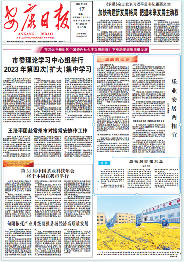 (2023年4月17日安康日?qǐng)?bào)01版開設(shè)“在習(xí)近平新時(shí)代中國(guó)特色社會(huì)主義思想指引下推動(dòng)安康高質(zhì)量發(fā)展”“溫暖的回響”欄目)