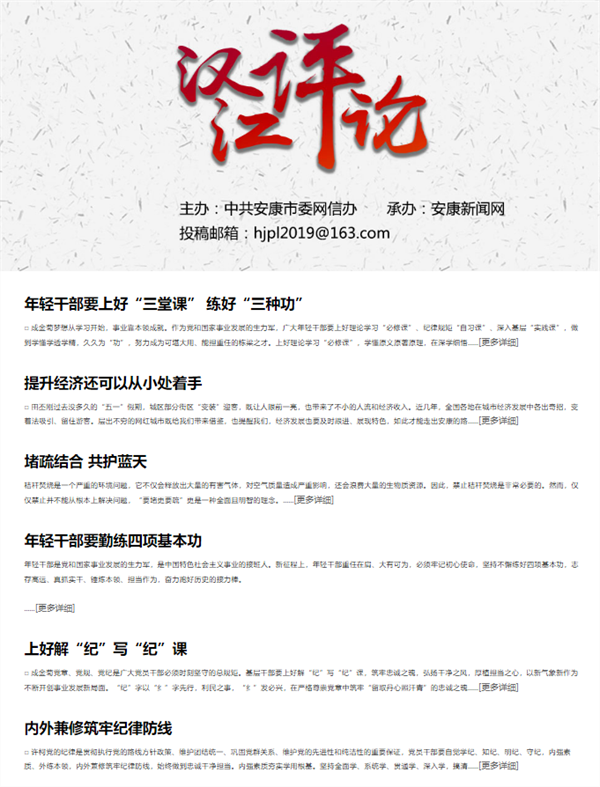 三是圍繞省委、市委“三個(gè)年”活動(dòng)部署,網(wǎng)站開設(shè)“一把手開麥——聚焦‘三個(gè)年’”專欄,聚焦我市“高質(zhì)量項(xiàng)目推進(jìn)年、營商環(huán)境突破年、干部作風(fēng)能力提升年”主題報(bào)道,為推進(jìn)安康高質(zhì)量項(xiàng)目發(fā)展、助力擦亮“營商環(huán)境最安康”金字招牌、提升全市干部作風(fēng)能力,營造濃厚良好輿論氛圍。