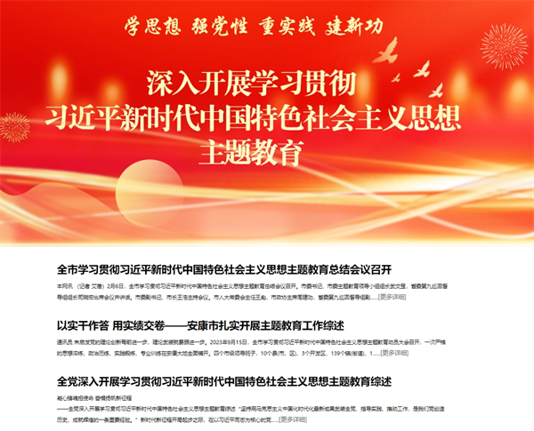 二是圍繞“深入開展學(xué)習(xí)貫徹習(xí)近平新時(shí)代中國特色社會主義思想主題教育”。安康新聞網(wǎng)認(rèn)真統(tǒng)籌謀劃,深入開展學(xué)習(xí)貫徹習(xí)近平新時(shí)代中國特色社會主義思想主題教育宣傳報(bào)道工作。網(wǎng)站及時(shí)推出“深入開展學(xué)習(xí)貫徹習(xí)近平新時(shí)代中國特色社會主義思想主題教育”專欄,介紹我市、各縣(市、區(qū))及單位部門組織開展主題教育的經(jīng)驗(yàn)做法。