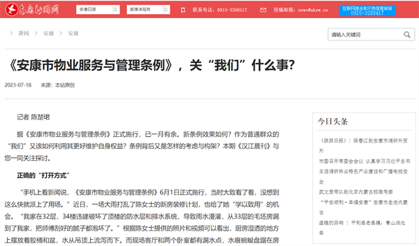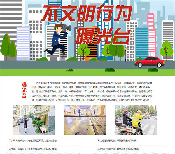 安康新聞網(wǎng)履行媒體輿論監(jiān)督職能,聚焦民生熱點(diǎn),開辦《不文明行為曝光臺》輿論監(jiān)督專欄,集中曝光身邊的不文明現(xiàn)象、行為,引導(dǎo)市民群眾自覺規(guī)范文明行為,主動(dòng)融入城市文明創(chuàng)建熱潮,為提升市民文明素質(zhì)和城市文明程度貢獻(xiàn)媒體力量。同時(shí),聚焦群眾關(guān)切,積極開展調(diào)查性報(bào)道,發(fā)布《〈安康市物業(yè)服務(wù)與管理?xiàng)l例〉關(guān)“我們”什么事?》等一批原創(chuàng)新聞,還原事件真相,及時(shí)宣講與群眾生活息息相關(guān)的最新政策條例,體現(xiàn)地方黨媒的責(zé)任與擔(dān)當(dāng)。