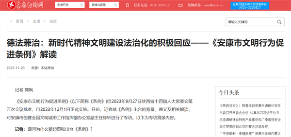 2023年,安康新聞網(wǎng)站準(zhǔn)確刊播政策消息,保證了政務(wù)消息、惠民消息及時(shí)準(zhǔn)確地傳播。發(fā)揮黨媒資源優(yōu)勢,準(zhǔn)確闡釋解讀市委、市政府的重要決策和惠民政策,刊出《德法兼治:新時(shí)代精神文明建設(shè)法治化的積極回應(yīng)——〈安康市文明行為促進(jìn)條例〉解讀》《安康市2023年義務(wù)教育階段學(xué)校招生入學(xué)政策解讀》,從群眾關(guān)切入手,提升媒體服務(wù)質(zhì)量和為民服務(wù)意識。