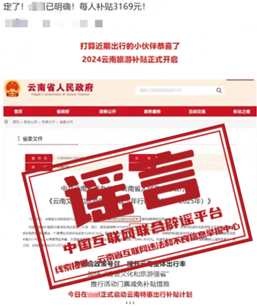 真相:近期,網(wǎng)絡(luò)平臺(tái)上出現(xiàn)多條題為《定了!XXX已明確!每人補(bǔ)貼3169元!》的信息,聲稱云南官方正在發(fā)放大額旅游補(bǔ)貼,游客花499元就可享受6天5晚云南深度游。這些帖文還附有一張《中共云南省委辦公廳云南省人民政府辦公廳印發(fā)〈云南文化和旅游強(qiáng)省建設(shè)三年行動(dòng)(2023—2025年)〉》的截圖。對(duì)此,云南省文化和旅游廳綜合執(zhí)法監(jiān)督局發(fā)布辟謠聲明稱,經(jīng)核實(shí),網(wǎng)傳《定了!XXX已明確!每人補(bǔ)貼3169元!》相關(guān)帖文均為不實(shí)消息。提醒廣大消費(fèi)者在購買旅游產(chǎn)品時(shí),共同抵制“不合理低價(jià)游”,如遇出現(xiàn)“特惠出行”“限時(shí)補(bǔ)貼”等字樣產(chǎn)品,請(qǐng)謹(jǐn)慎購買,避免“貪便宜,出大事”。(來源:@云南省文旅執(zhí)法)