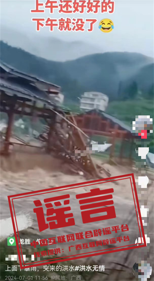 詳情:近日,有網(wǎng)民發(fā)布視頻稱“桂林龍勝一風(fēng)雨橋被洪水沖毀”,并配文“上午還好好的,下午就沒(méi)了”,引發(fā)關(guān)注。經(jīng)當(dāng)?shù)毓膊块T(mén)核實(shí),偉江鄉(xiāng)轄區(qū)內(nèi)風(fēng)雨橋完好無(wú)損,不存在倒塌的情況。該視頻系當(dāng)?shù)鼐W(wǎng)民龍某某罔顧事實(shí)、故意編造,將網(wǎng)上看到的其他地方的風(fēng)雨橋被毀視頻重新編輯并定位在偉江鄉(xiāng)進(jìn)行發(fā)布。目前,警方已依法對(duì)龍某某予以行政處罰。(來(lái)源:廣西互聯(lián)網(wǎng)辟謠平臺(tái)、龍勝公安)
