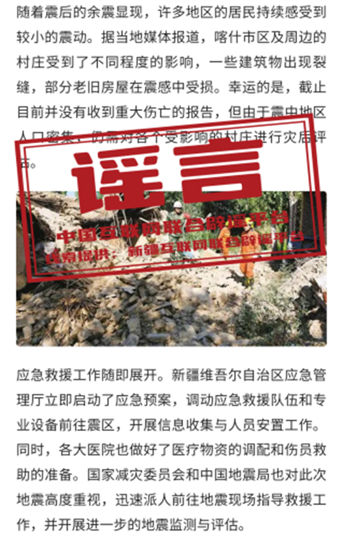 真相:近日,有網(wǎng)民發(fā)布帖文稱“新疆喀什市7月22日發(fā)生6.3級地震,周邊村莊建筑出現(xiàn)裂痕,部分老舊房屋在震感中受損……”。經(jīng)新疆喀什市應急管理局證實,當日喀什市域內(nèi)未發(fā)生地震,中國地震臺網(wǎng)也未發(fā)布喀什當日發(fā)生地震的相關(guān)信息,此信息為虛假內(nèi)容。(來源:網(wǎng)信新疆、新疆喀什網(wǎng)絡舉報)