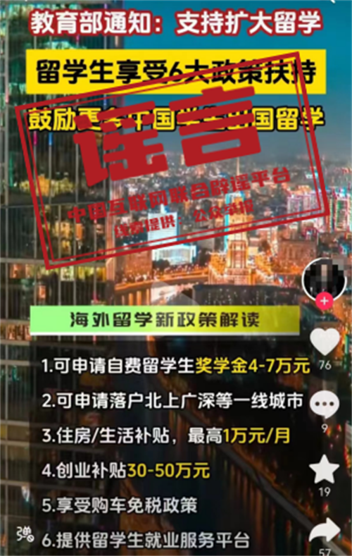 詳情:近日,有自媒體在多個網(wǎng)絡(luò)平臺發(fā)布視頻,稱“教育部留學(xué)中心召開發(fā)布會宣布‘將擴(kuò)大支持留學(xué),留學(xué)生將享受申請自費(fèi)留學(xué)獎學(xué)金、申請落戶一線城市等六大政策扶持’等留學(xué)新政策”。對此,教育部留學(xué)服務(wù)中心7月29日鄭重聲明:該視頻虛假不實(shí),我中心從未召開此發(fā)布會,從未發(fā)布過相關(guān)政策。所謂六大政策支持,主要是對部分地方有關(guān)政策的拼湊和夸大。請廣大留學(xué)生及公眾提高警惕,謹(jǐn)防上當(dāng)受騙。對此類造謠炒作行為,我中心保留追究相關(guān)方法律責(zé)任的權(quán)利。(來源:“教育部留學(xué)服務(wù)中心”微信公眾號)