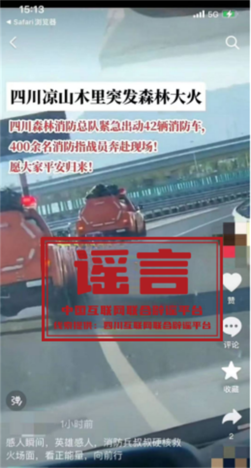 真相:近日,有網(wǎng)民在短視頻平臺(tái)上發(fā)布視頻,并配以“四川涼山木里突發(fā)森林大火,四川森林消防總隊(duì)緊急出動(dòng)42輛消防車(chē),400余名消防指戰(zhàn)員奔赴現(xiàn)場(chǎng)”的文字。當(dāng)?shù)鼐W(wǎng)信部門(mén)聯(lián)動(dòng)應(yīng)急管理局進(jìn)行查核,證實(shí)四川涼山木里近日未發(fā)生森林大火。(來(lái)源:四川互聯(lián)網(wǎng)舉報(bào)辟謠平臺(tái))