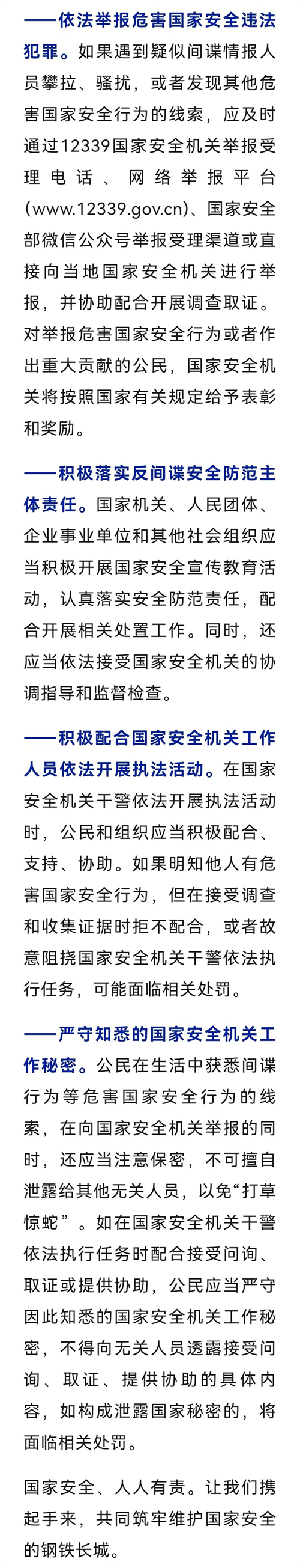 詳情:近年來(lái),國(guó)家安全機(jī)關(guān)在人民群眾支持配合下,有力開(kāi)展各項(xiàng)工作,堅(jiān)決維護(hù)國(guó)家主權(quán)、安全、發(fā)展利益!吨腥A人民共和國(guó)反間諜法》和《國(guó)家安全機(jī)關(guān)行政執(zhí)法程序規(guī)定》、《國(guó)家安全機(jī)關(guān)辦理刑事案件程序規(guī)定》等法律法規(guī)規(guī)章為人民群眾配合協(xié)助開(kāi)展國(guó)家安全機(jī)關(guān)工作、共同維護(hù)國(guó)家安全提供了法律依據(jù)。(來(lái)源:“國(guó)家安全部”微信公眾號(hào))