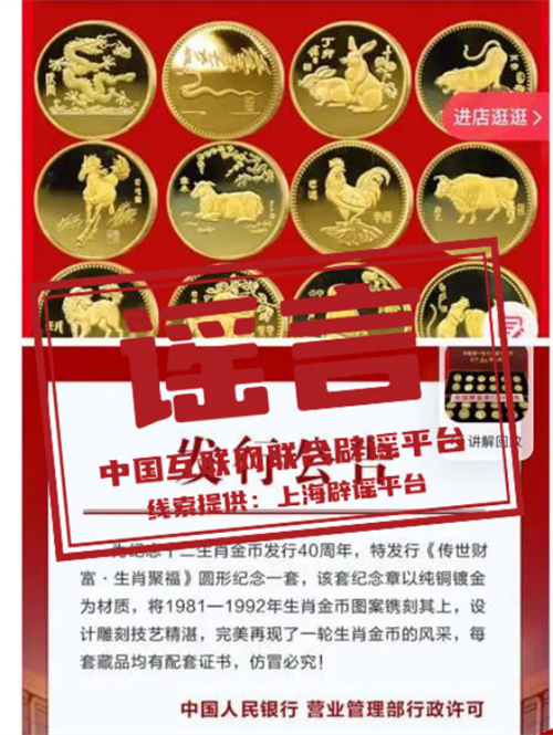 真相:“為紀(jì)念十二生肖金幣發(fā)行40周年,特發(fā)行《傳世財富·生肖聚!穲A形紀(jì)念章一套”“一次性收齊央行十二生肖紀(jì)念幣”……直播間里的各種“紀(jì)念幣”,有的甚至帶有“央行發(fā)行公告”等“紅頭文件”,讓人真假難辨。經(jīng)上海網(wǎng)信部門調(diào)查發(fā)現(xiàn),上述網(wǎng)傳商品與央行發(fā)行的紀(jì)念幣有著天壤之別。很多商家故意混淆“紀(jì)念章”與“紀(jì)念幣”、“央行圖樣許可”與“央行發(fā)行”的區(qū)別,誤導(dǎo)公眾。事實上,“紀(jì)念幣”由央行發(fā)行,分為普通紀(jì)念幣與貴金屬紀(jì)念幣,“紀(jì)念章”則是商家自行設(shè)計制造的,與央行沒有關(guān)系;而“圖樣行政許可”只是表示央行同意相關(guān)單位在產(chǎn)品上使用人民幣圖樣,并不代表產(chǎn)品由央行發(fā)行。對公眾來說,想要分辨是“央行發(fā)行”還是“商家生產(chǎn)”,一是可以通過央行官網(wǎng)查看每年發(fā)行的普通紀(jì)念幣和貴金屬紀(jì)念幣項目;二是看紀(jì)念幣或紀(jì)念鈔是否有面額和貨幣單位,其中貨幣單位為“元”。(來源:“上海網(wǎng)絡(luò)辟謠”微信公眾號)