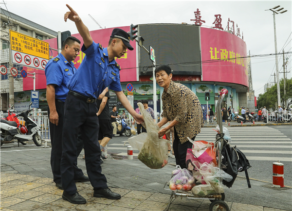 7月23日,江北交警、城管在中渡街整頓交通和農(nóng)貿(mào)市場(chǎng)。(郭曉康)