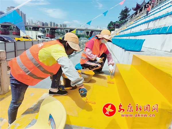 5月30日,工人們在第二十四屆安康漢江龍舟節(jié)主會場進(jìn)行地面第二輪刷漆。據(jù)市市政園林處現(xiàn)場負(fù)責(zé)人介紹,截至目前,已搭建隔離護(hù)欄3715米,建立安檢門及疏散通道18個、蛇形通道8個,制作安裝導(dǎo)視牌10塊,對看臺區(qū)立面刷漆2629平方米,擦拭清洗并固定座椅3794個。錢運(yùn)立 攝