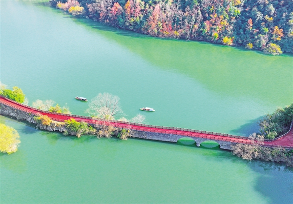 該景區(qū)有遠觀景點織女石、鳥語花香玉興島、愛情主題金螺島、休閑勝地翠屏島等三島一遠觀景點。以游船聯(lián)絡(luò)水上交通,“行船向三島,鷗鷺共遠近”,冬日里的瀛湖更是給游客展現(xiàn)出一幅浪漫、詩意、氤氳的唯美畫卷。(李成寶 文/圖)
