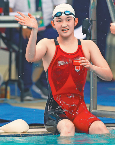 | 9月3日,李冰潔在獲得女子1500米自由泳冠軍后向觀眾致意。 |