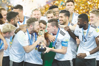 | 7月2日,俄羅斯圣彼得堡舉行的2017年聯(lián)合會杯足球賽決賽中,德國隊以1∶0戰(zhàn)勝智利隊,奪得冠軍。德國隊球員在頒獎儀式上捧杯慶祝。 |