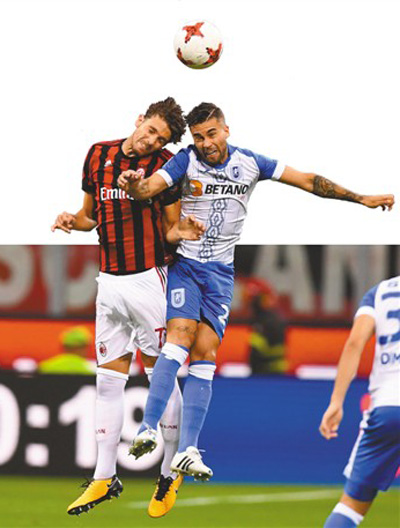 | 8月3日,在意大利米蘭進行的歐聯(lián)杯資格賽第三輪次回合比賽中,意甲AC米蘭隊主場以2∶0戰(zhàn)勝羅馬尼亞克拉約瓦大學隊。圖為兩隊球員在拼搶。 |