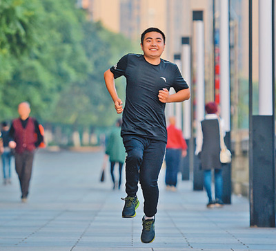 熊軍奔跑在重慶市萬(wàn)州區(qū)北濱路上。 冉孟軍攝