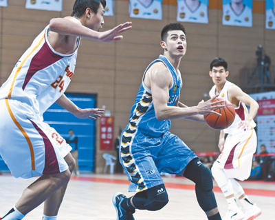 | 1月20日,北京隊(duì)球員方碩(中)在對(duì)陣浙江隊(duì)的比賽中進(jìn)攻。 |