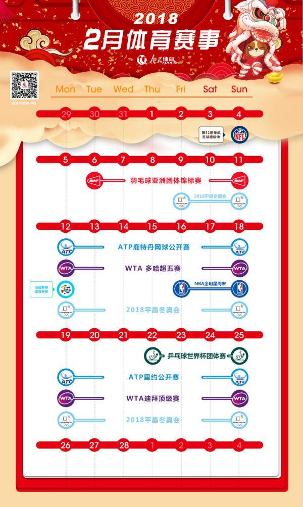 2月恰逢中國(guó)新春佳節(jié),在這辭舊迎新的月份中,體壇也大賽不斷。四年一屆的冬奧會(huì),中國(guó)冰雪健兒是否會(huì)有新的突破,人民體育記者將親赴現(xiàn)場(chǎng),為您報(bào)道;乒乓球世界杯團(tuán)體賽是乒壇開(kāi)年的首個(gè)大賽。2017下半年經(jīng)歷小低谷的中國(guó)男乒急需為自己正名,面對(duì)擁有波爾、奧恰洛夫的德國(guó)隊(duì),以及進(jìn)步明顯的日本隊(duì),他們能否一一擊敗收獲8連冠,我們拭目以待。除此之外,NBA全明星周末對(duì)每個(gè)籃球迷都是大節(jié)日,看籃球巨星如何玩轉(zhuǎn)比賽;亞冠聯(lián)賽也將在本月開(kāi)賽,中國(guó)球隊(duì)的表現(xiàn)令人期待。春節(jié)長(zhǎng)假,闔家歡聚,邊看比賽邊過(guò)大年,這體驗(yàn)一定不錯(cuò),收藏我們的賽歷,精彩賽事,一覽無(wú)遺。